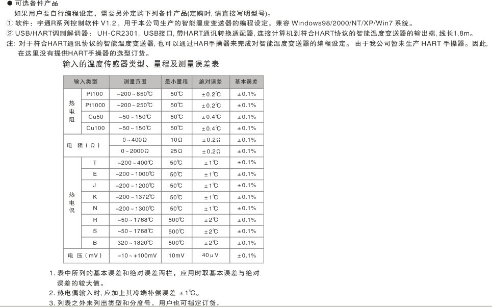 標(biāo)準(zhǔn)精度:±0.1%(參見(jiàn)溫度傳感器類型、量程及測(cè)量誤差表)