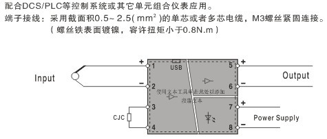 熱電偶或毫伏信號(hào)輸入,經(jīng)過(guò)隔離變送輸出標(biāo)準(zhǔn)的直流信號(hào)至控制系統(tǒng)或其它單元組合儀表。