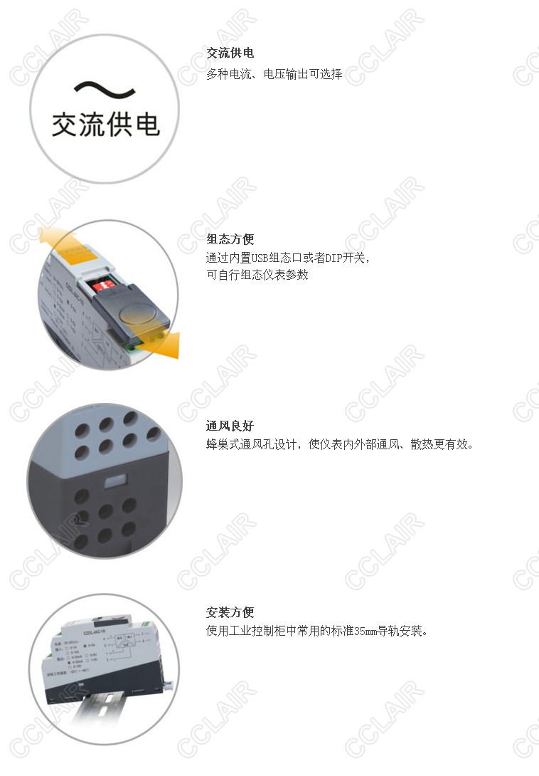 小巧的外殼結(jié)構(gòu),35mm標(biāo)準(zhǔn)導(dǎo)軌安裝方式,多種電流、電壓輸出可選擇。