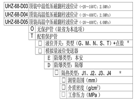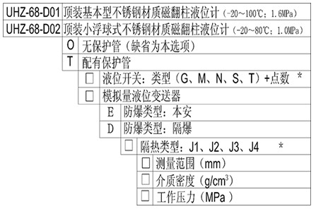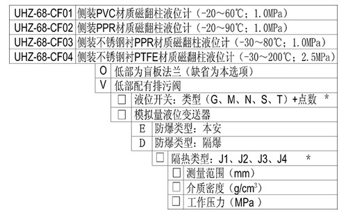 UHZ-68-CF01/CF02/CF03/CF04為四種側(cè)裝式防腐型磁翻柱液位計,CF01的材質(zhì)為加強型PVC,主 要特 點是經(jīng)濟實用,缺點是易老化,不易在露天環(huán)境下使用;CF02的材質(zhì)為PPR,可以用于一般場合的 防腐使 用;CF03的材質(zhì)為不銹鋼內(nèi)襯PPR,強度和使用壽命較CF02型均有提高; CF04的材質(zhì)為不銹鋼 內(nèi)襯PTFE, 主要特點是具有較高的耐腐蝕的性能和優(yōu)秀的耐溫、承壓性能。