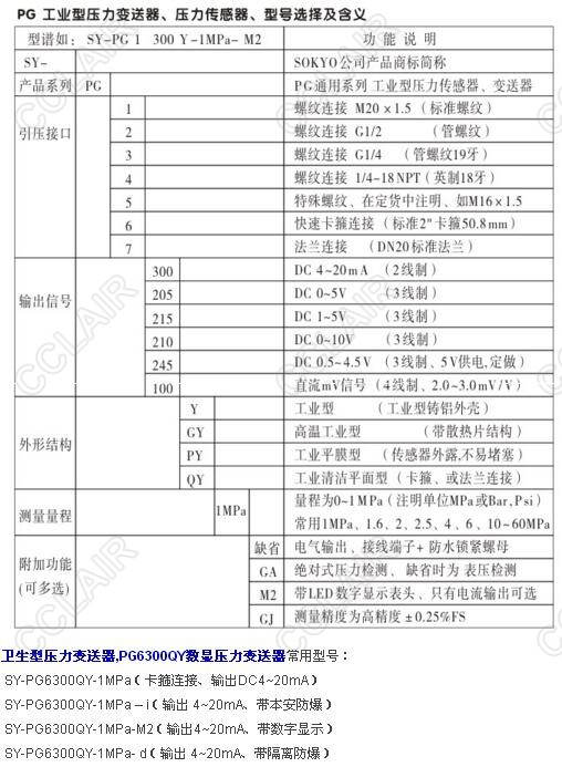 SY-PG6300QY-1MPa(卡箍連接、輸出DC4~20mA) SY-PG6300QY-1MPa-i(輸出 4~20mA、帶本安防爆) SY-PG6300QY-1MPa-M2(輸出4~20mA、帶數(shù)字顯示) SY-PG6300QY-1MPa- d(輸出 4~20mA、帶隔離防爆)