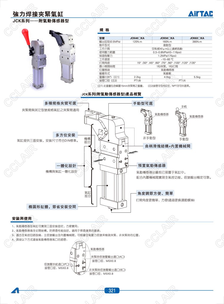 亞德客AIRTAC,JCK40KA,JCK50KA,JCK63KA,強力焊接夾緊氣缸-附氣動傳感器型