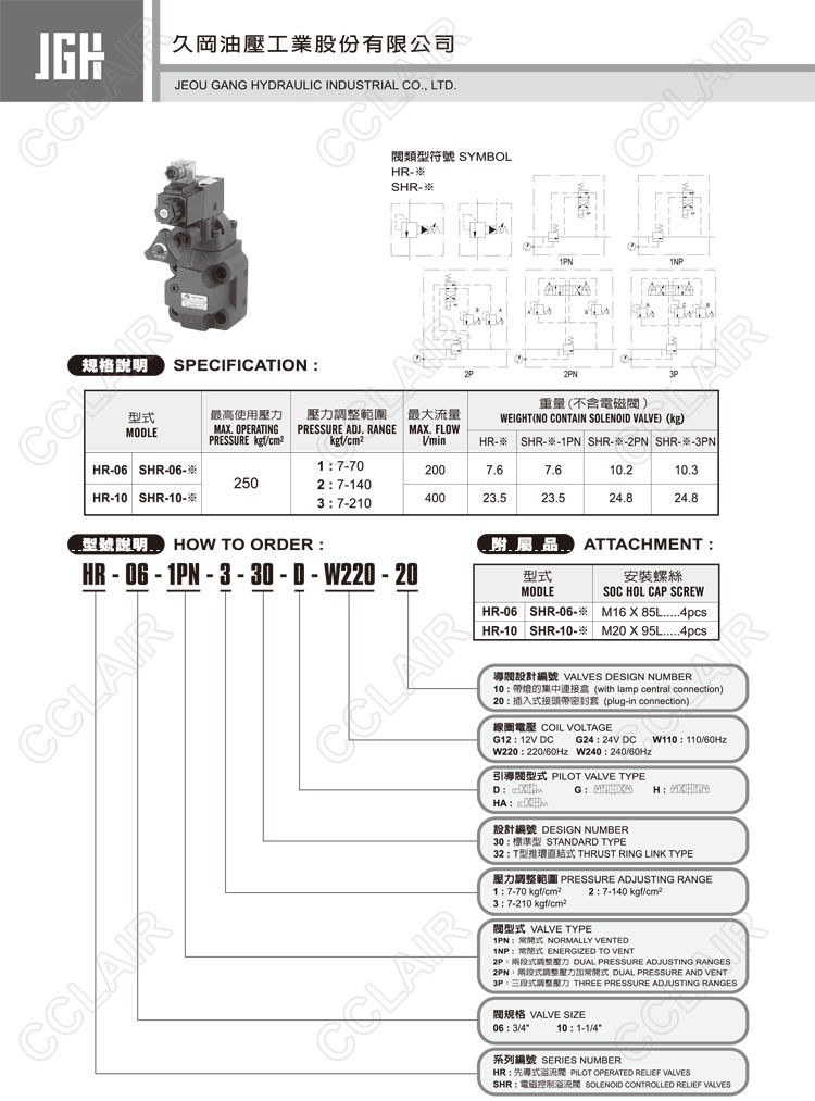 JeouGang臺灣久岡,先導式溢流閥HR-06-1PN-1-30-D-G12-10,HR-06-1PN-3-30-HA-W220-10,HR-10-1NP-2-32-HA-W110-20,SHR-06-1PN-1-30-HA-G12-10,SHR-06-2PN-3-30-H-W240-10,SHR-10-1NP-3-32-G-G12-10,SHR-10-3P-3-32-HA-W240-20