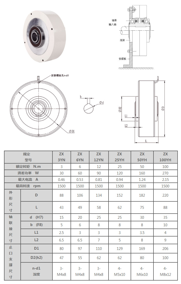 ZX型空心軸、止口支撐、超薄磁粉制動(dòng)器轉(zhuǎn)矩:3~100N.m,額定電壓DC24V,冷卻方式為自然冷卻.使用時(shí)注意周圍濕度,避免磁粉受潮,影響其性能。