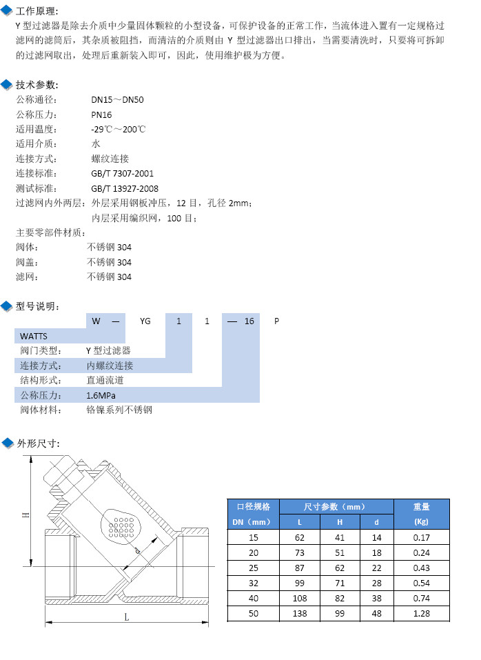 W-YG11-16P-DN15,W-YG11-16P-DN20,W-YG11-16P-DN25,不銹鋼螺紋Y型過濾器