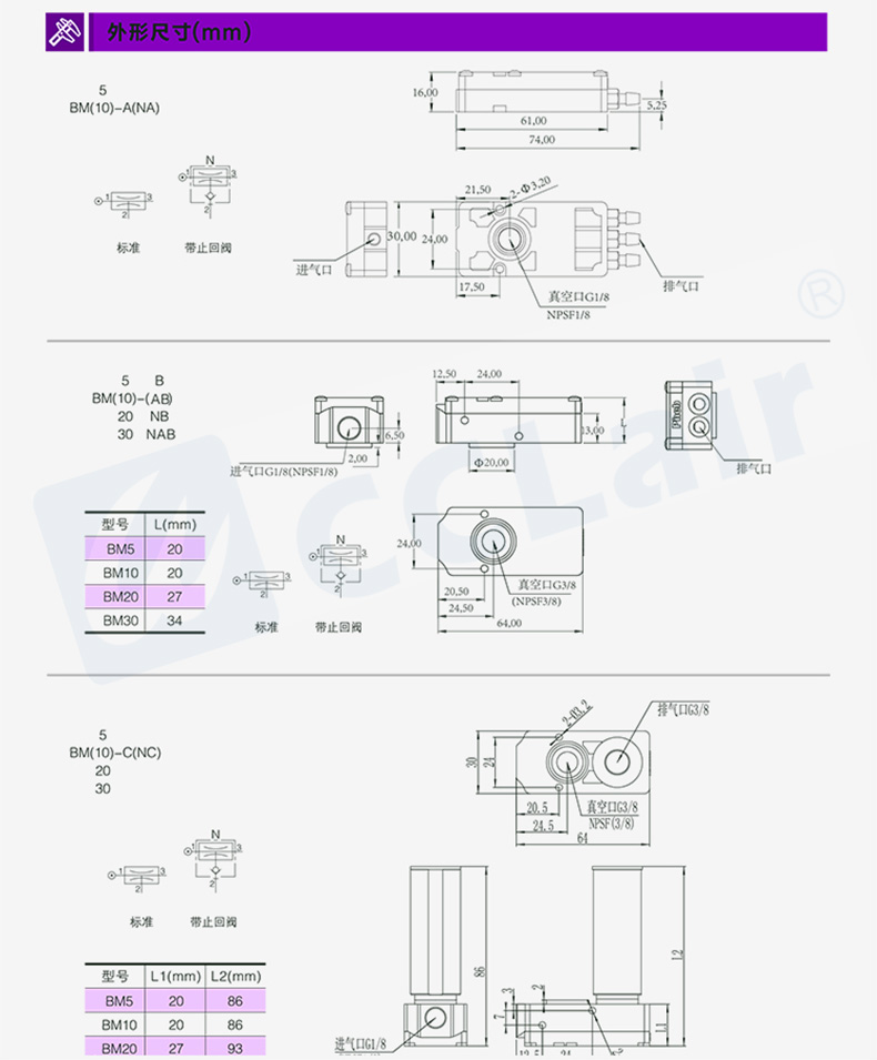 迷你型多級真空發(fā)生器BM05-A,BM05-B,BM05-C,BM10-A,BM10-B,BM10-C,BM20-B,BM20-C,BM30-B,BM30-C,