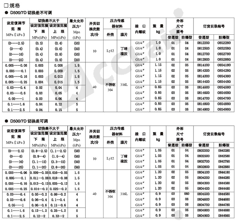 0812207,0814507,0812507,0814607,壓力控制器 D500/7DK切換差不可調 0812707,0814707,0812807,0814807, 0814107,0814907,0814207,0814307,0814407,