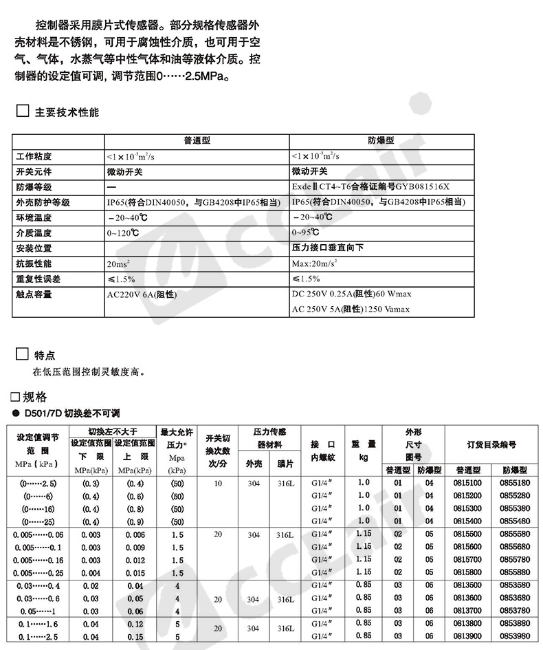 0845180,0843580,0845280,0843680,壓力控制器 防爆 D501/7D切換差可調(diào)