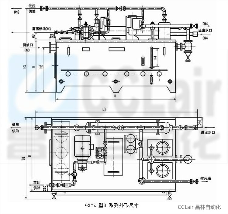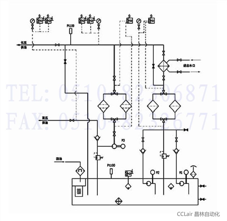 | 本油站為整體式,由油箱、兩臺(tái)低壓油泵、一臺(tái)高壓油泵、二臺(tái)雙筒網(wǎng)片式過濾器、回油磁網(wǎng)過濾裝置、列管式油冷卻器、各種控制閥門、管道以及電接點(diǎn)壓力表、鉑熱電阻等組成。 工作原理基本上也和A系列相同;但B系列的低壓油經(jīng)過過濾和冷卻后外供時(shí),一部分低壓油通過旁路再經(jīng)過一個(gè)雙筒過濾器后才進(jìn)入高壓泵的吸油口,以提高高壓油的清潔度等級(jí);但應(yīng)注意當(dāng)?shù)蛪汗┯蛯?shí)際壓力較小時(shí)(例如小于0.2MPa時(shí)),由于后一過濾器同樣也有壓差損失(也隨時(shí)間逐步增大),為保證高壓油泵順利吸入,吸入口應(yīng)始終保證正壓(當(dāng)后過濾器切換前壓差達(dá)最大時(shí)也必須滿足這一要求);除 流量和A系列有很大不同外,最主要特點(diǎn)(結(jié)構(gòu)特征)為高壓泵吸口前有另一臺(tái)過濾器。 其他工作原理和操作控制可參見A系列所述。 |