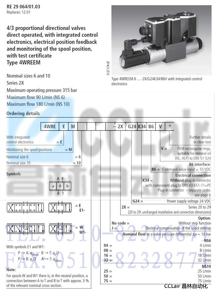 4WREEM10E50-2X/G24K34/B6V,4WREEM10E75-2X/G24K34/B6V,比例方向閥,力士樂REXROTH,德國(guó)力士樂,價(jià)格