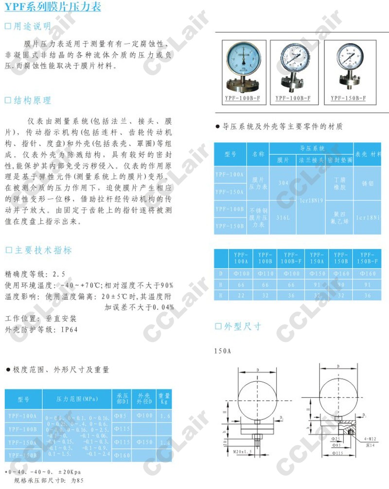 YPF-100A,YPF-100B,YPF-100B-F,YPF-150B-F,YPF-150A,YPF-150B,膜片壓力表,CCLair