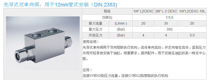 HYVBPDE 1/4" L2 CEXC,HYVBPDE 3/8" L2 CEXC,HYVBPDE 1/4" L2 CEXC-10L,先導(dǎo)式雙單向閥 |