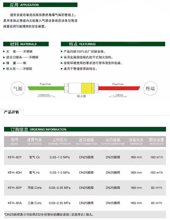 KFH-60Y,KFH-60H,KFH-60P,KFH-60A,阻火器/回火防止器