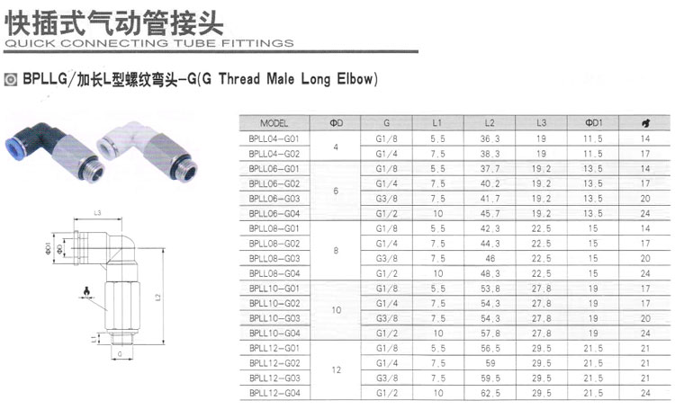 BPLL04-G01,BPLL06-G01,BPLL08-G01,BPLL10-G01,BPLL12-G01,快插式氣動(dòng)管接頭