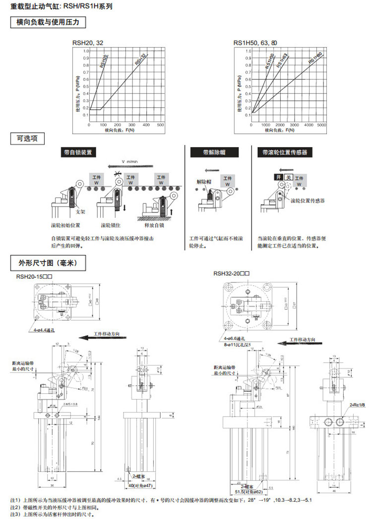 RSH20-15D,RSH20-15B,RSH20-15T,RSH32-20D,RS1H50-30D,RS1H63-30D,RS1H80-40D,SMC重載型止動氣缸