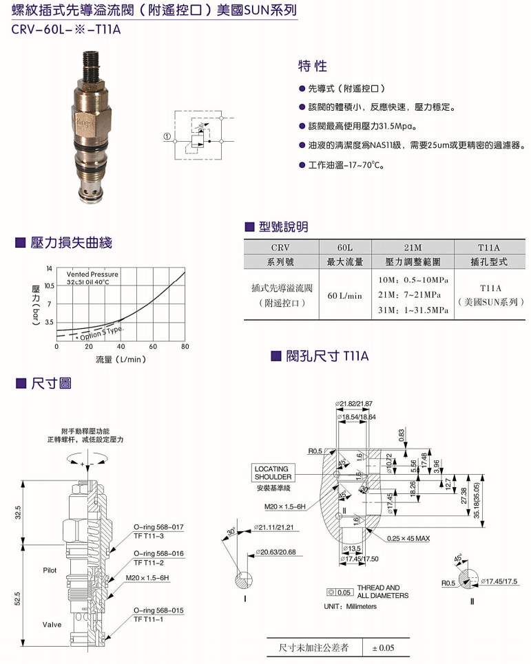 CRV-60L-10M-T11A,CRV-60L-21M-T11A,CRV-60L-31M-T11A,螺紋插式先導(dǎo)溢流閥